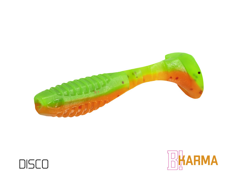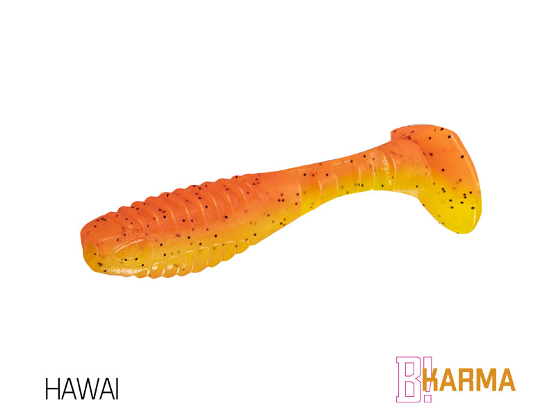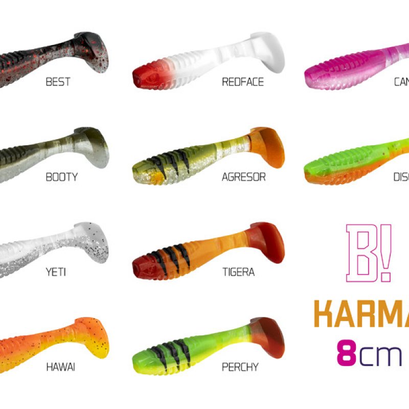 Od početka smo KARMU osmislili kao neobičan model klasičnog proizvoda. Naš cilj je bio stvoriti svestrani mamac, ali da to učinimo na svoj način. Prvo što možete primijetiti je neobičan omjer repa i tijela. Veći rep uzrokuje netipično kretanje mamca, kada se rep mrda, a tijelo se lagano kotrlja s jedne strane na drugu, oponašajući ranjeni plijen. Takvo kretanje izuzetno dobro privlači ribu i donosi vam nove mogućnosti prezentacije mamca. Između tijela i repa su tri ureza koji daju prirodniji izgled, a samo tijelo je nazubljeno na trbuhu i na leđima. Ova vrsta površine povećava vibracije u vodi i zbog ureza; uvijek možete vidjeti gdje treba umetnuti udicu i gdje napušta tijelo. Vrlo je jednostavno umetnuti šablonu. Prednji dio mamca (usta) ima urez za bolje pristajanje na jig glavu.