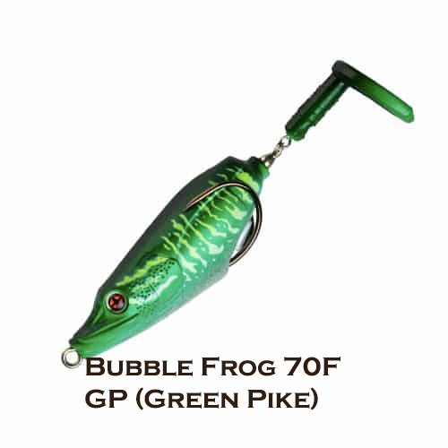 Bubble Frog 70F je vrhunski površinski mamac! Kombinira sve kvalitete potrebne za ribolov u zakrčenim područjima. Šuplje tijelo jedinstvenog dizajna povezano je s fleksibilnim PVC repom u obliku lopatice pomoću zakretnog zgloba od nehrđajućeg čelika. Na najmanji pokret, rep se okreće i stvara poseban zvuk – između buzzbaita i ploppera.