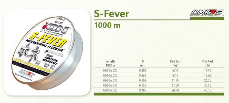 Awa-Shima ION Power S-Fever je najlon pakiran od 1000m, neutralan bojom, univerzalan namjenom. Proizvođač naglašava njegovu visoku otpornost na abraziju, nosivost na čvoru i dobre bacačke osobine. Dostupne debljine 0,309 i 0,354mm i 0.40mm odgovarati će i morskim i slatkovodnim ribolovcima za ribolov na postavu oradu, brancina, šarana, smuđa, štuke…