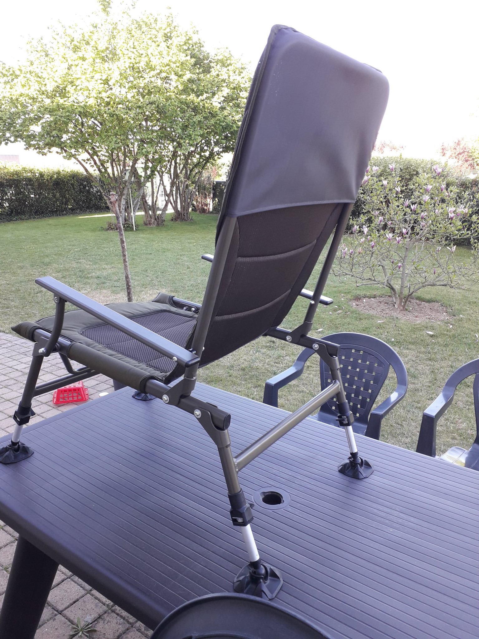 Kombinacija 3D mreže i poliestera u sjedalu osigurava prozračnost i udobnost, dok potpuno podesive noge s velikim okretnim čizmama za blato jamče stabilnost na svim terenima.