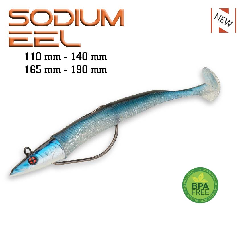 Sakura Sodium Eel još jedan je od noviteta Sakure za 2021.g. kod kojeg su njegovi dizajneri prvenstveno na umu imali ribolov brancina. Sodium Eel imitacija je male jeguljice ili iglice koja dolazi montirana na odgovarajuću jig glavu i opremljena VMC-ovom udicom sakrivenom u tijelu varalice čiji kut oka od 60 stupnjeva čini ovu varalicu odličnom u svim uvjetima ribolova u travi, posedoniji ili među konopima jer je gotovo nezakvačiva. Specifičan dizajn ove varalice daje joj fini, suptilni rad cijelim tijelom i uz usku siluetu odlično imitira plivanje jeguljice ili iglice koje su omiljeni plijen mnogih morskih grabežljivaca. Sodium Eel dostupan je u dvije veličine; 11 cm sa 7 g otežanjem i 14 cm sa 14 g otežanjem.